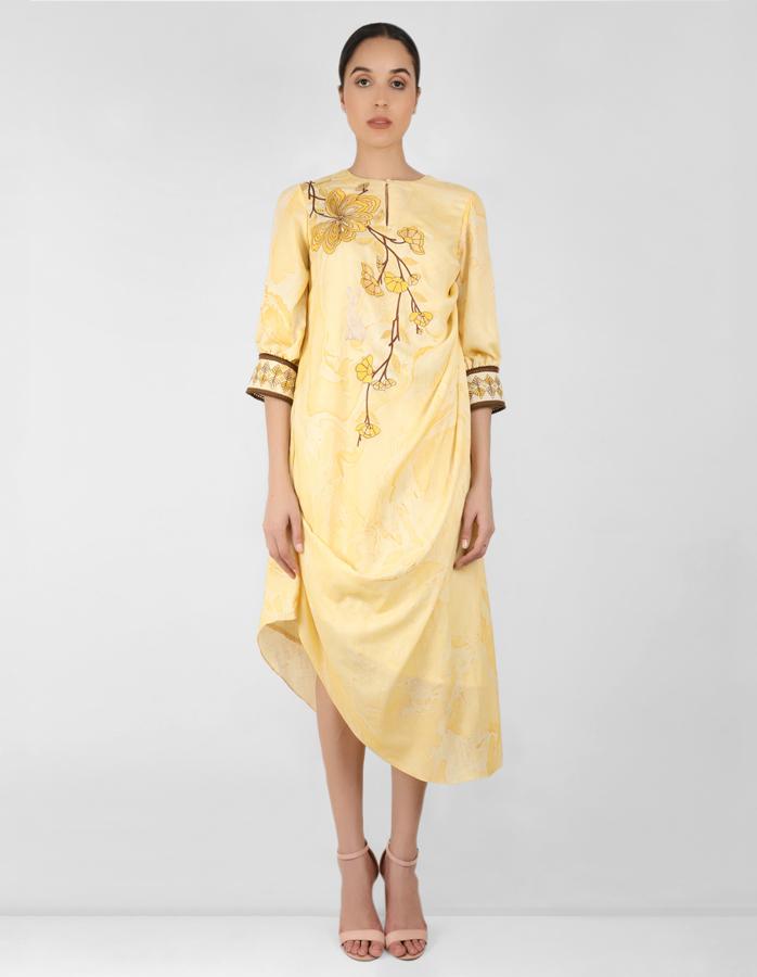 Yellow satin cotton marble printed draped tunic.embroidered with multi colour thread embroidery using aari technique with floral and animal motifs like cat,squirrel and rabbit.the cuff has embroidery with lace detailing on both the edges.